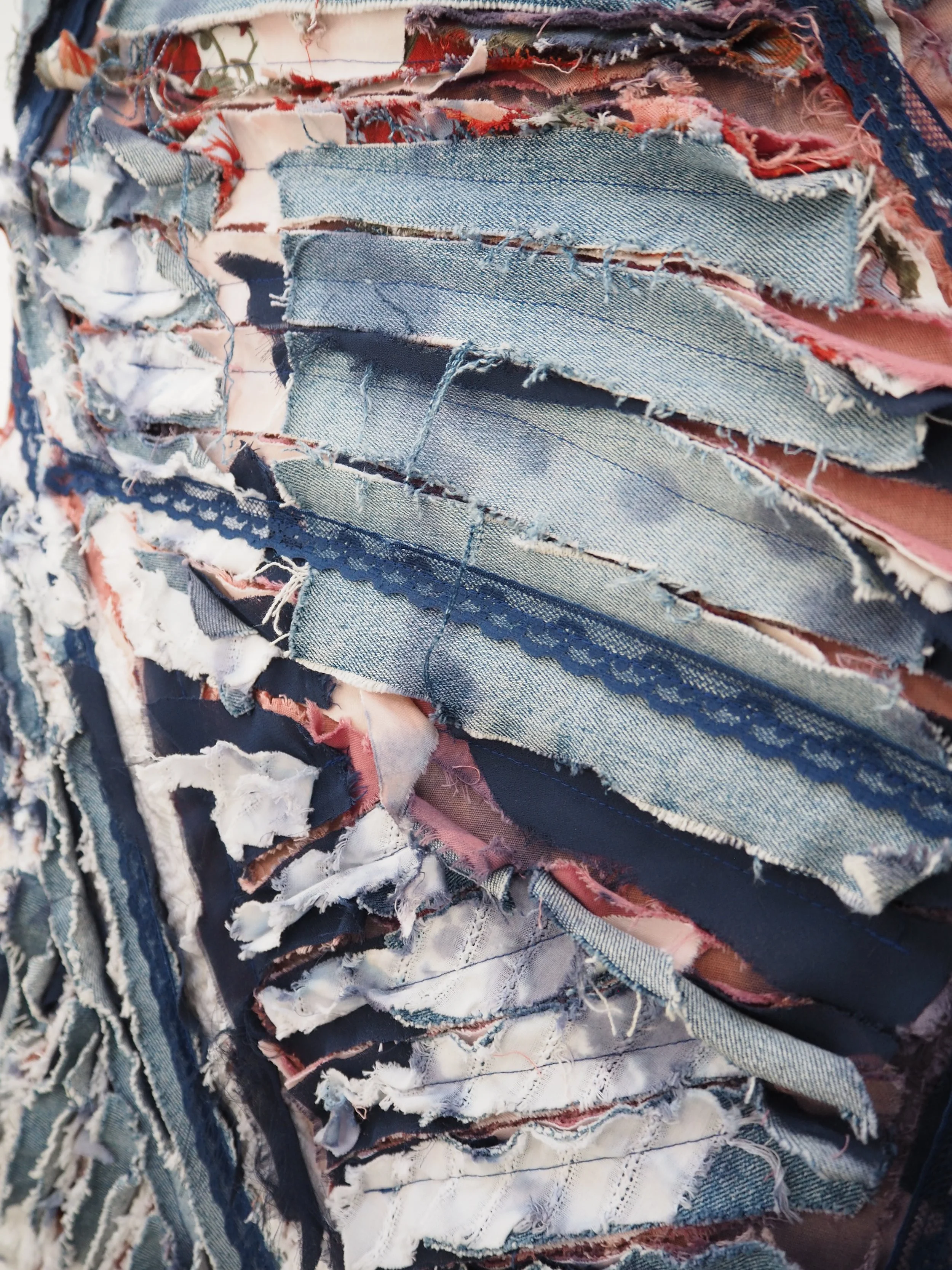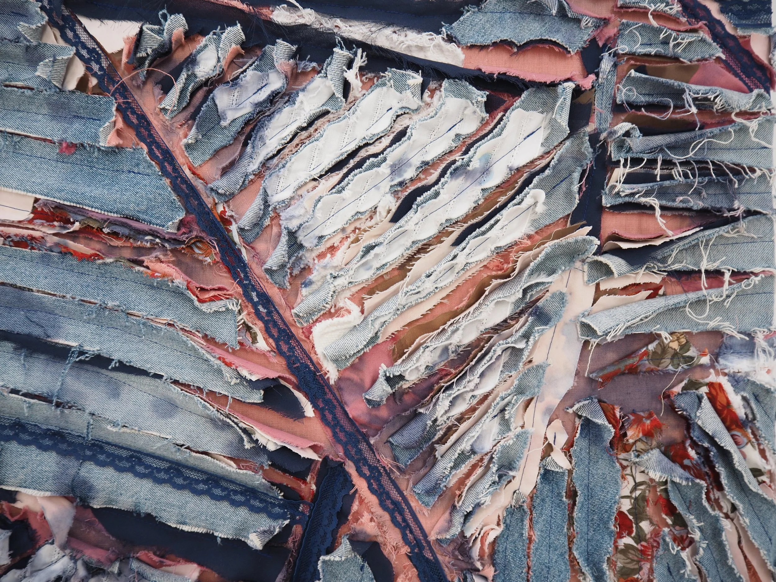 Things Forgotten, 2024, 37x41cm, Lace trim, bedsheets, denim jeans, other found fabrics, fabric dye and thread. $700