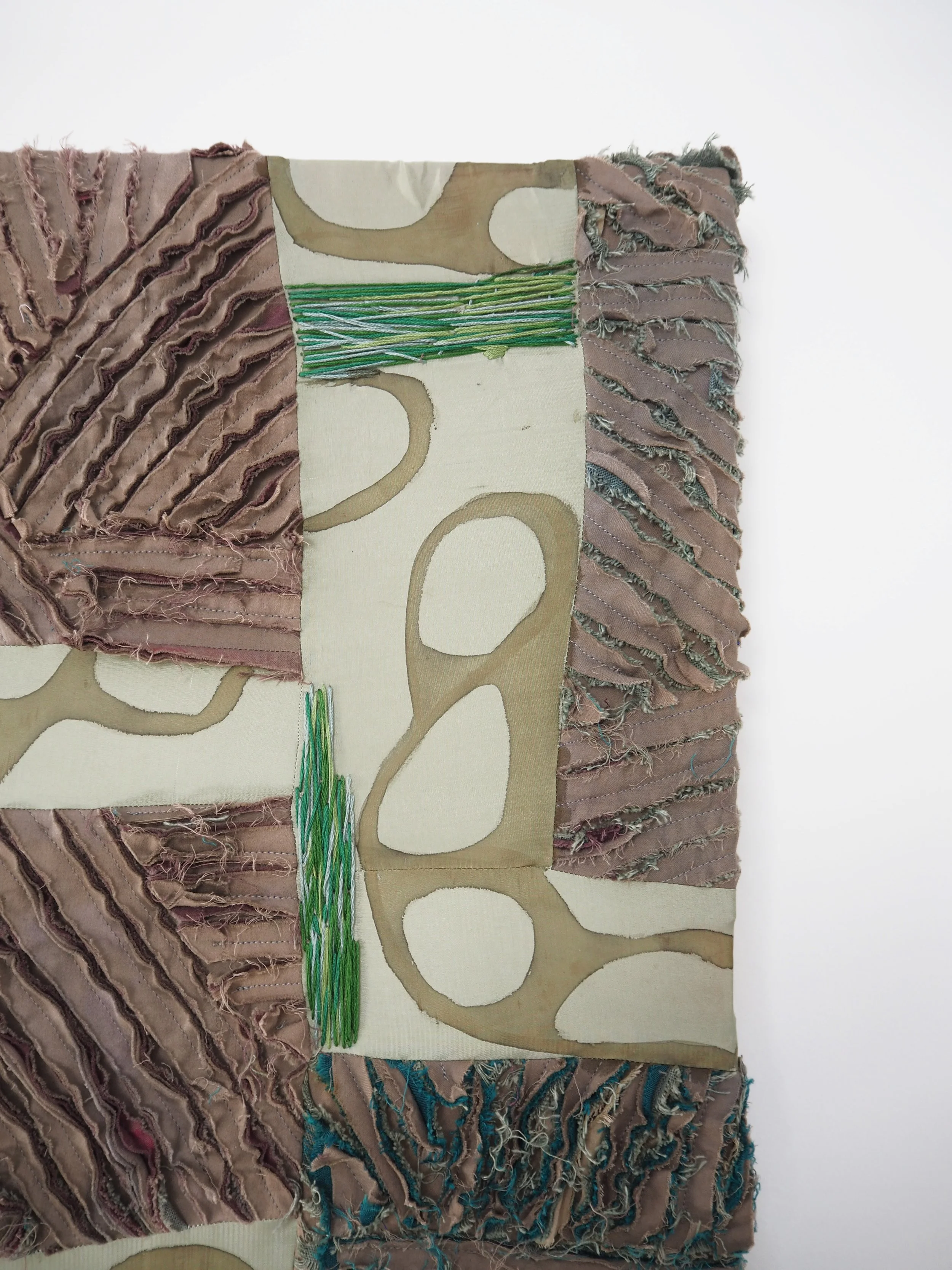 Untitled, 2024, 46x46cm Pillowcases, Bedsheets, Collected Fabrics, Fabric dye, and thread. $600.